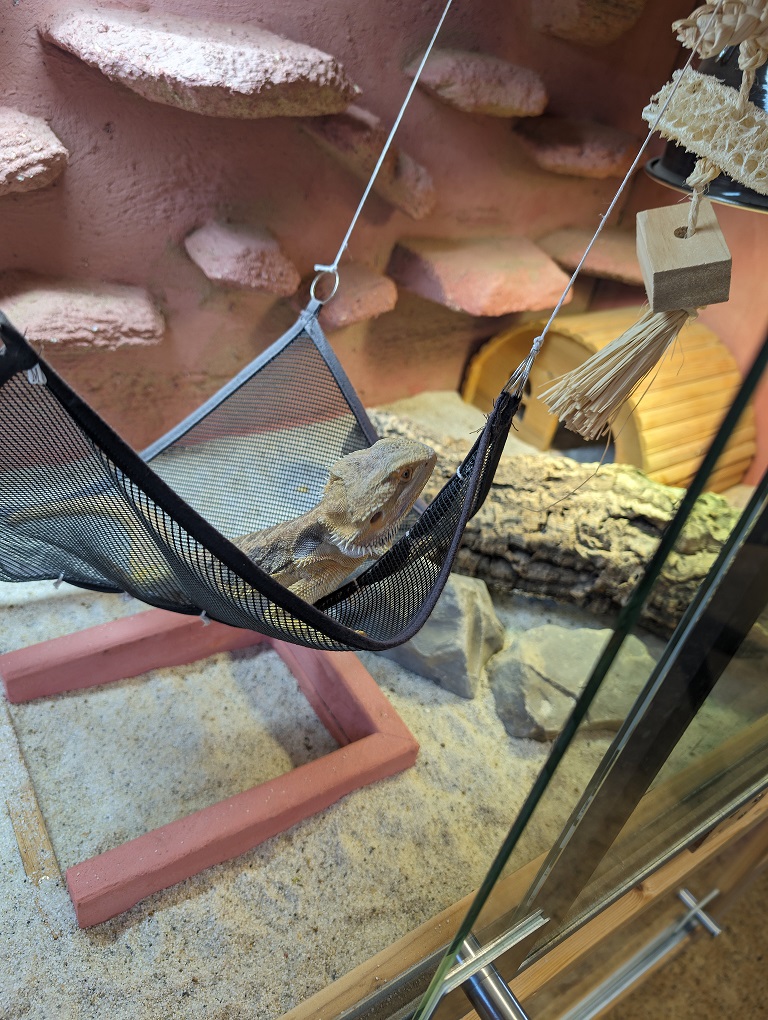 Misty hat sich letztes Jahr leider am Rücken verletzt, wodurch sie beim Laufen etwas humpelt. Trotzdem hindert es sie nicht daran, in die Hängematte zu klettern 🙂